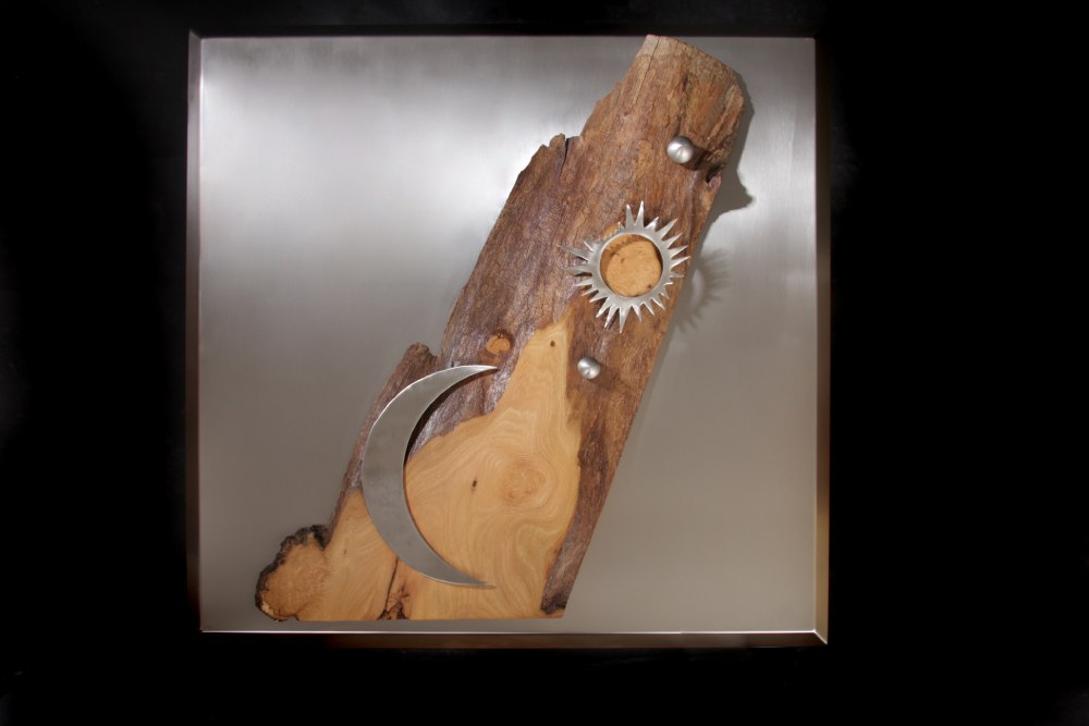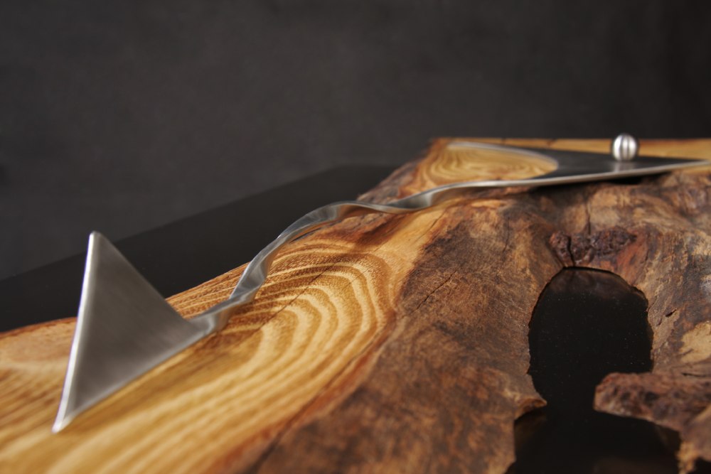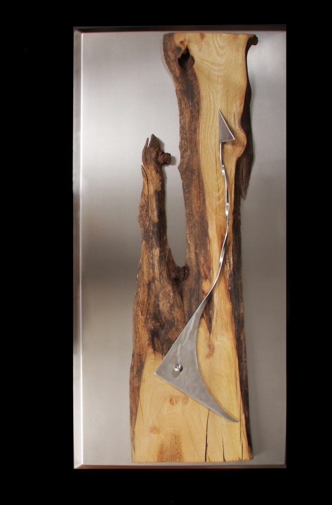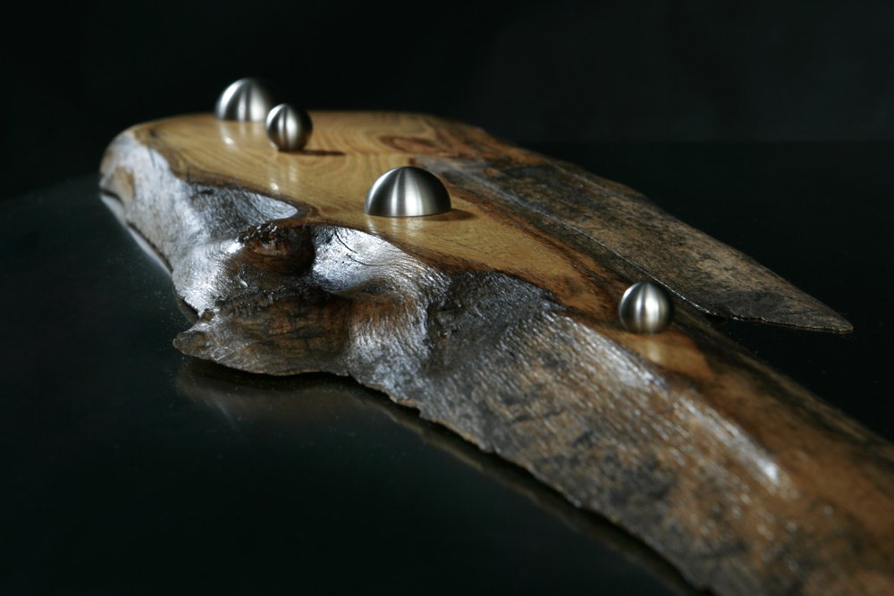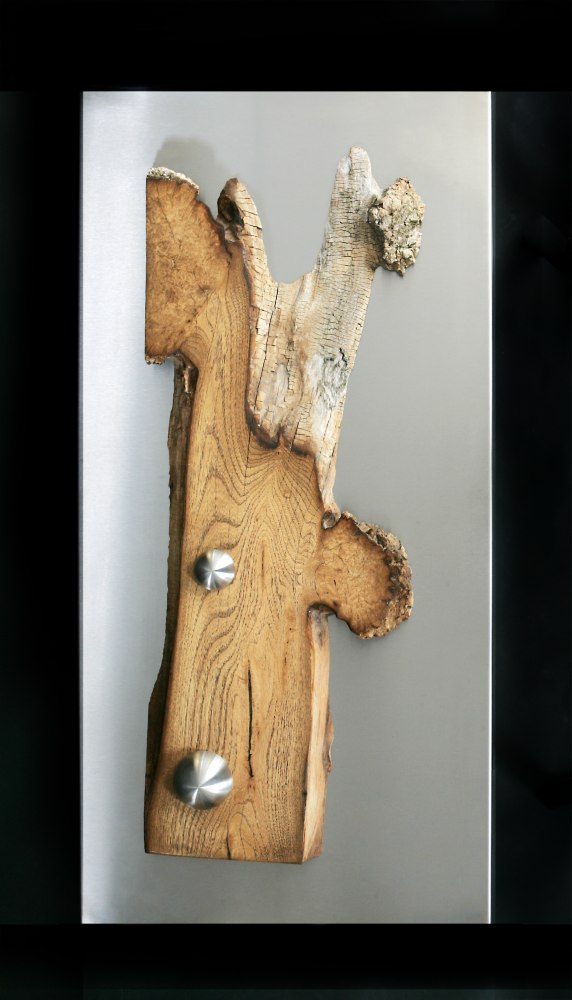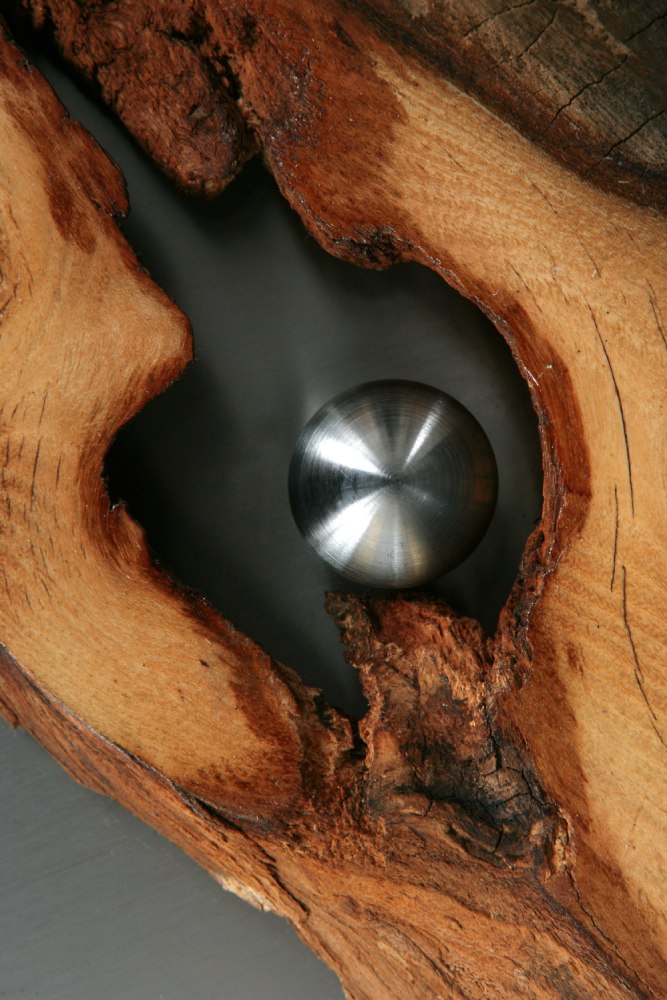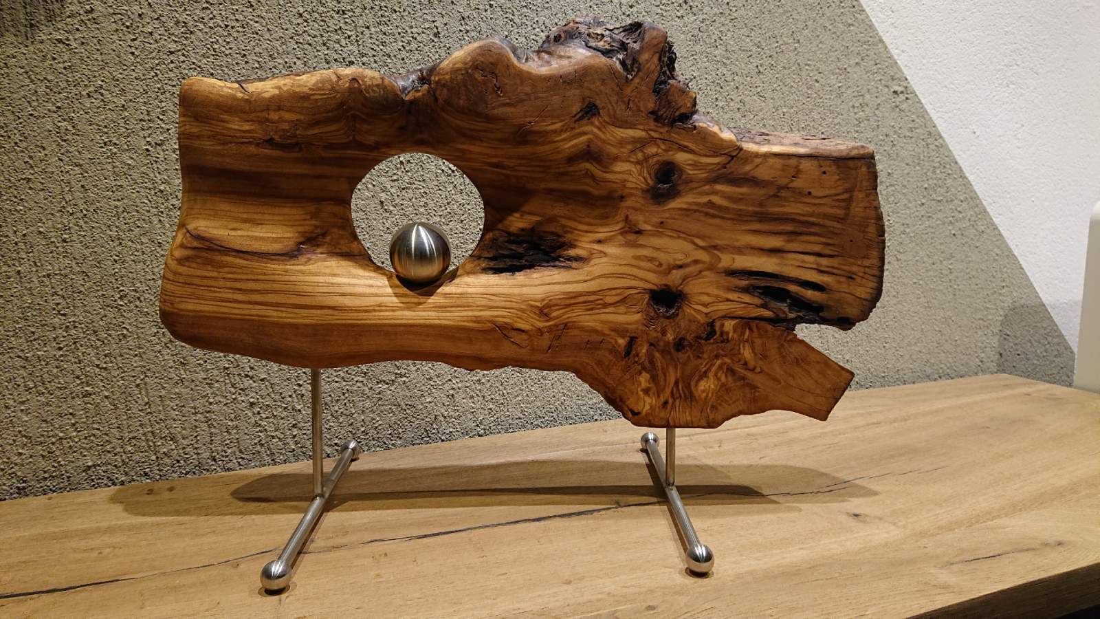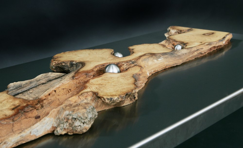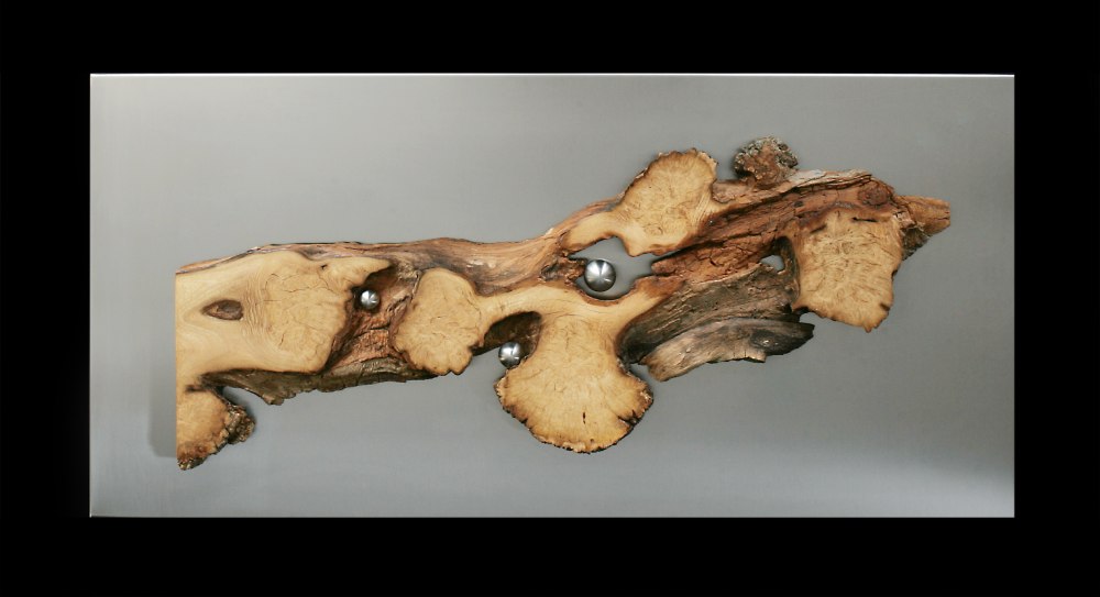 Glänzender Edelstahl und robustes Naturholz vereinen sich zu einem einzigartigen Kontrast von Mensch und Natur. Diese Dualität zweier Welten erzeugt einzigartige Kunstwerke, die in jedem Raum zum Blickfang werden.