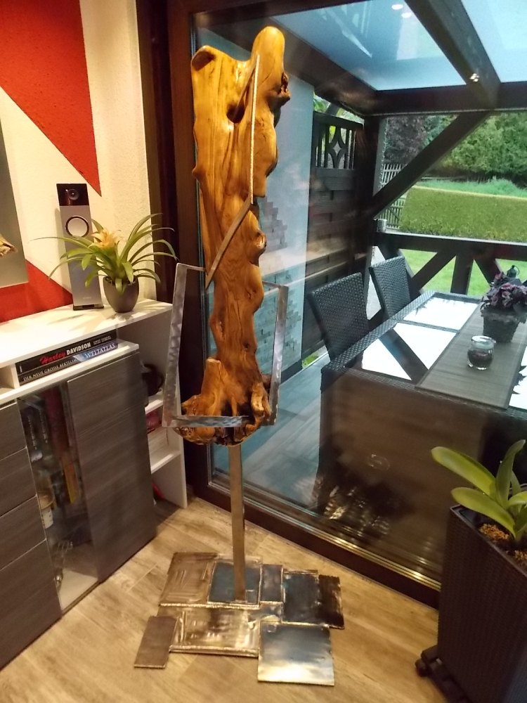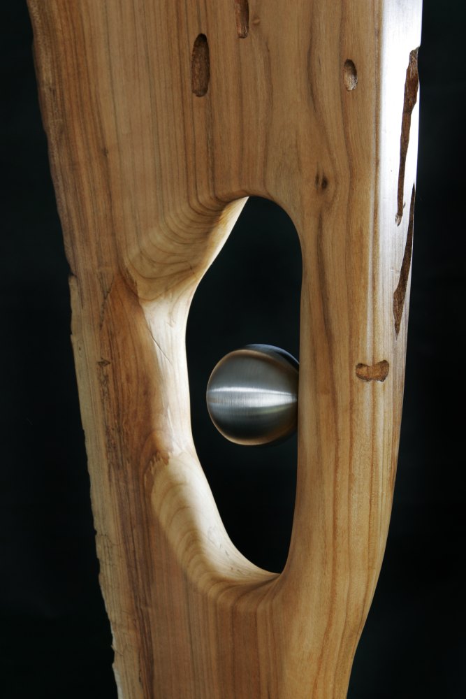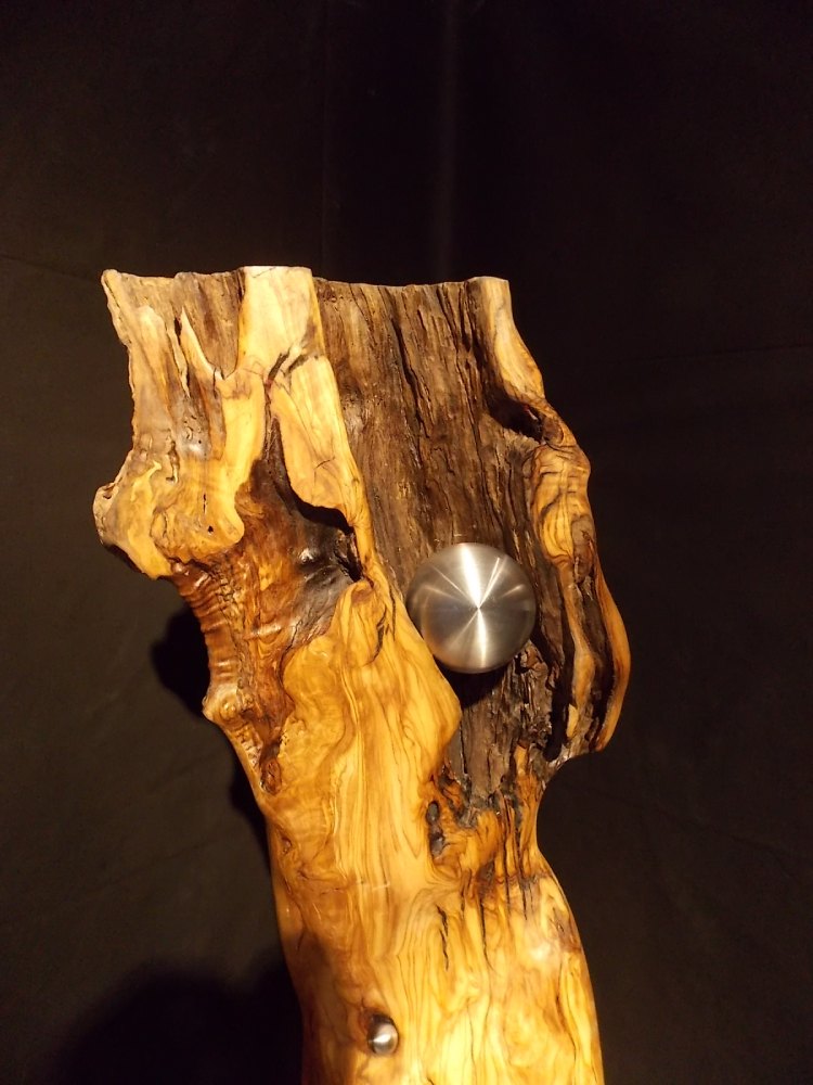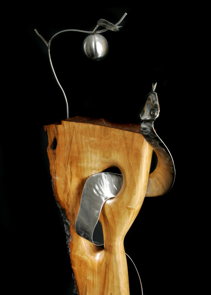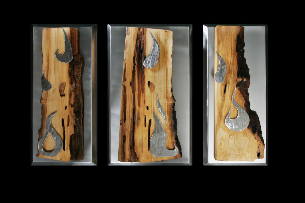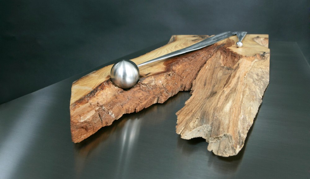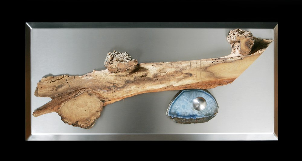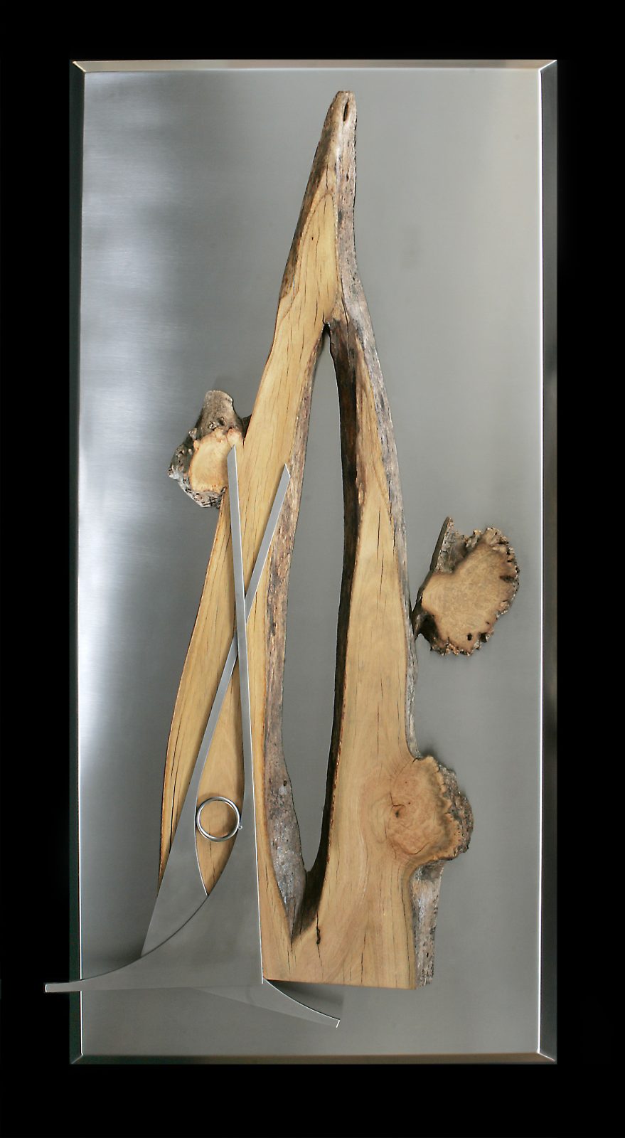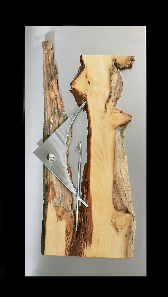 Glänzender Edelstahl und robustes Naturholz vereinen sich zu einem einzigartigen Kontrast von Mensch und Natur. Diese Dualität zweier Welten erzeugt einzigartige Kunstwerke, die in jedem Raum zum Blickfang werden.
